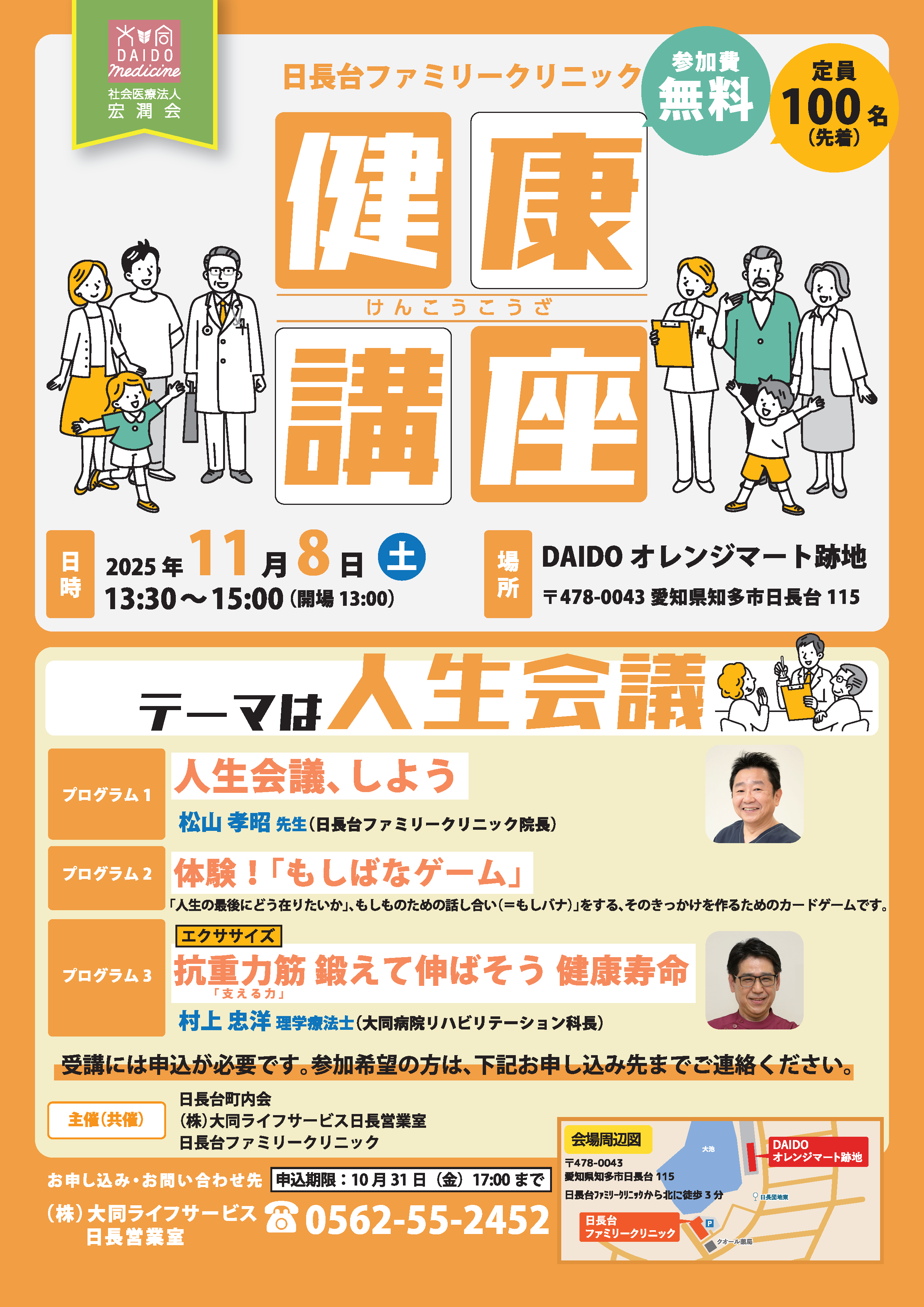 この講座では、日長台ファミリークリニックの松山院長からお話をしたあと、「もしばなゲーム」を使って、「人生会議」体験をします。