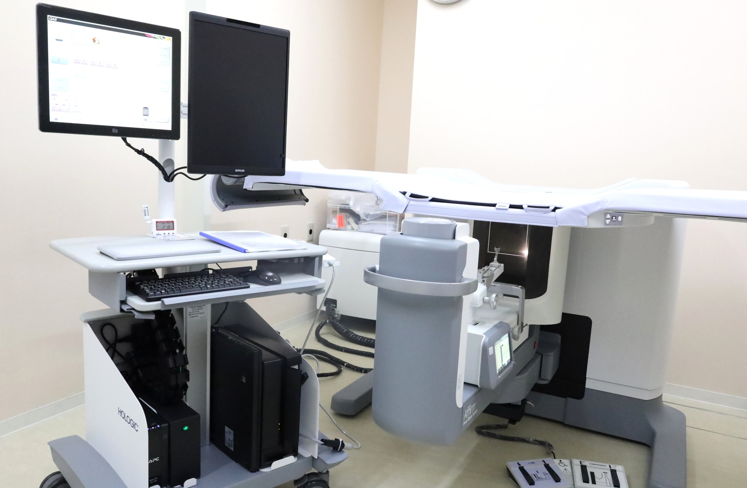 2025年10月に更新した機器では、患者さんはゆったりと伏臥位で検査を受けることができます。検査時間も大幅に短縮され、被曝量も低減されます。360度から乳房を映しながら、生検を行います。