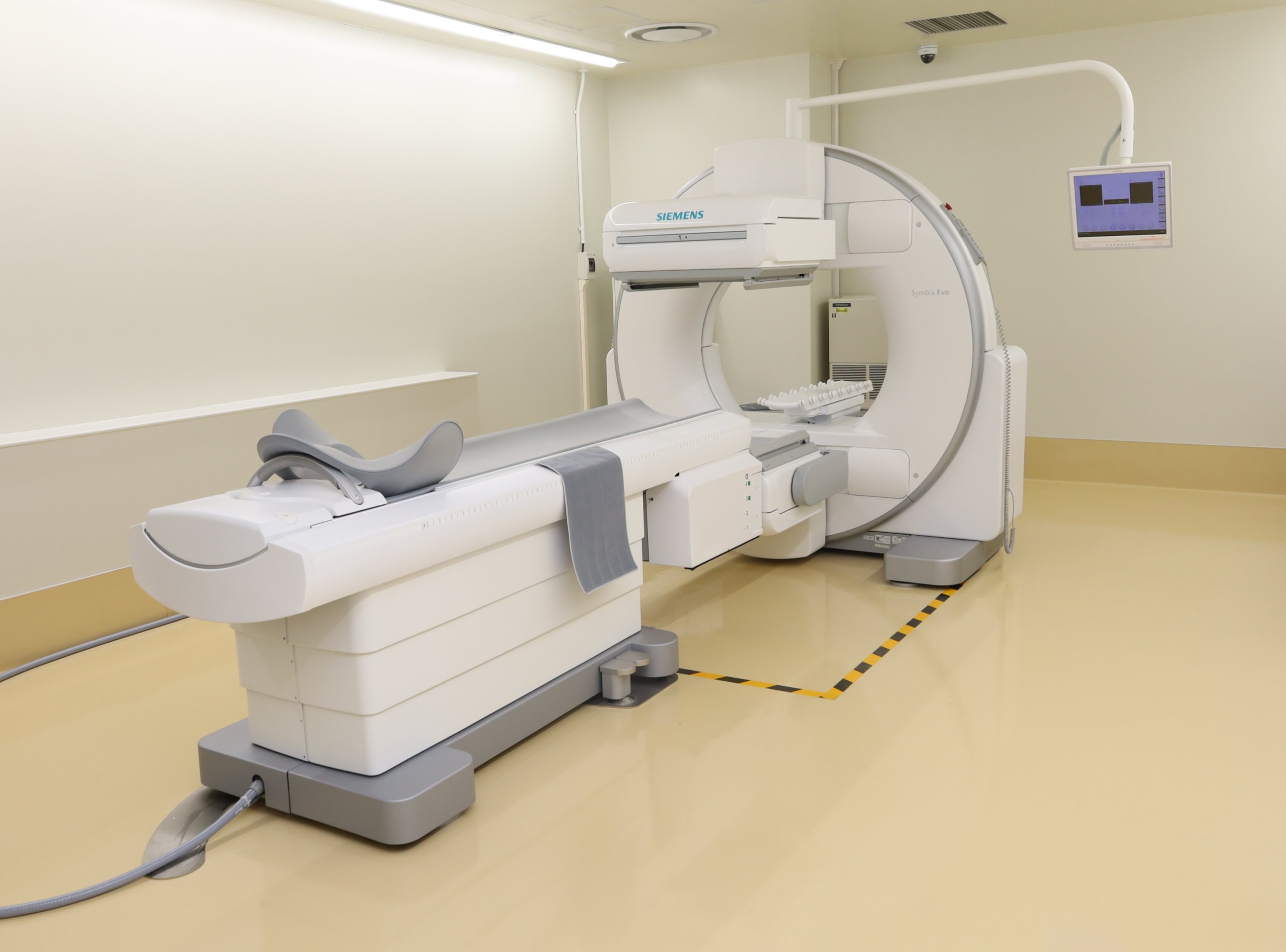 一般的な装置よりコンパクトな設計なため、狭い場所が苦手な患者さんにも易しい設計になっていることやタッチセンサーが増設されたことにより安全性が向上しました。また、寝台の天板が従来と比べ薄くなったことで天板下からの撮像におけるγ線の減弱を低減でき検査の質が向上します。装置導入に伴い、採用した新規アプリケーションにより検査時間短縮や高画質な画像を提供できます。