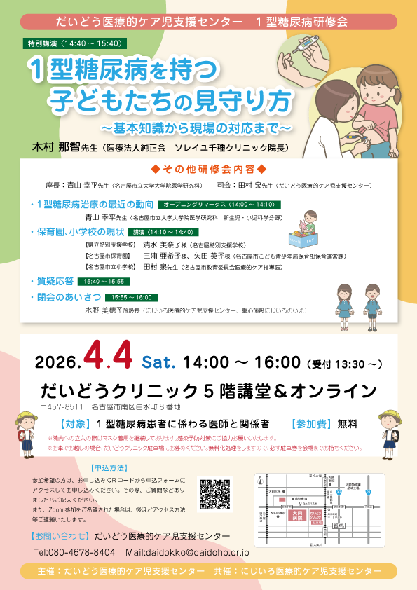 ホーム 学術講演会・研修会 お問い合わせ アクセス 学術講演会・研修会 開催予定 終了 学術講演会・研修会一覧 開催予定一覧 2026/04/04 1型糖尿病研修会 だいどう医療的ケア児支援センターが主催する1型糖尿病研修会のご案内です。 1 学術講演会・研修会 年別 すべて 2026年 2025年 2024年 2023年 2022年 2021年 2020年 2019年
