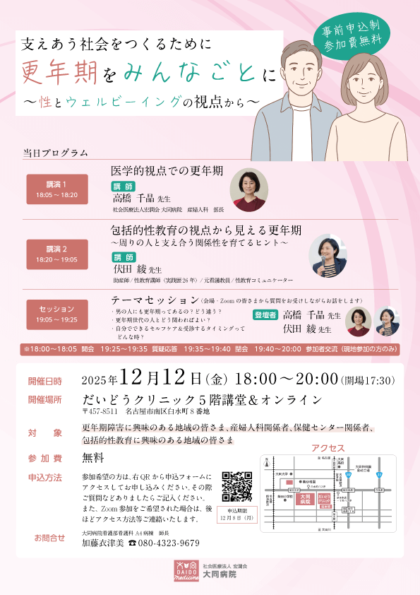 - 更年期障害に興味のある地域の皆さま、産婦人科関係者、保健センター関係者、包括的性教育に興味のある地域の皆さま