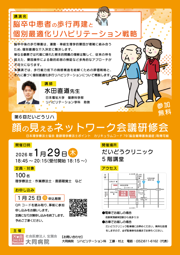 去る11月8日、リハビリテーション科が主催・企画を担った第3回「だいどうリハ顔の見える地域ネットワーク研修会」が開催されました。